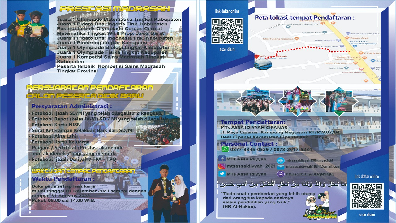 MTs ASSA'IDIYYAH CIPANAS menyediakan PPDB secara online diharapkan proses PPDB dapat berjalan cepat dan bisa dilakukan dimanapun dan kapanpun selama sesi PPDB Online dibuka. Proses pendaftaran calon siswa baru di masa pandemi Covid-19 ini dan terhambat oleh jarak jika datang ke madrasah langsung, bisa mengakses website PPDB Online MTs ASSA'IDIYYAH CIPANAS.